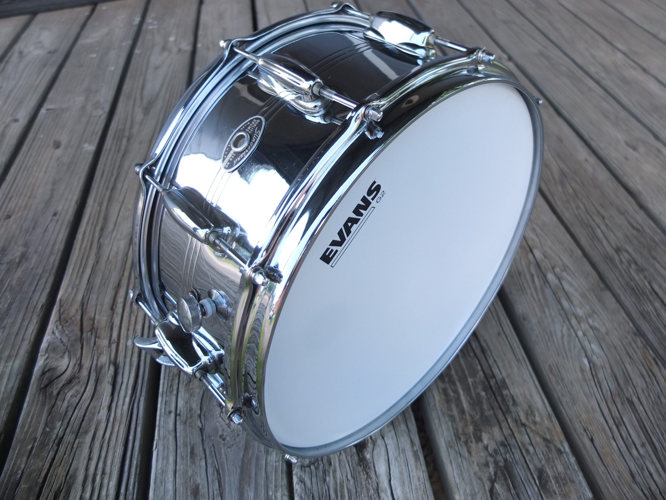 Here we have a 14×6.5 Slingerland Niles era Aluminum shell snare drum in very good condition. It has the acclaimed stick saver hoops with a modified throw off, and has new heads top and bottom. Its been completely refurbished and will certainly be a great addition to any collection.